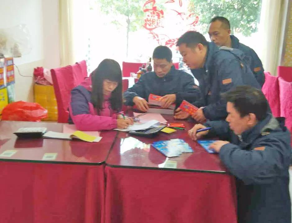 信豐市場部長(cháng)王富洋(左一(yī))、江西(xī)銷區(qū)招商部經理肖翔(左二)、尋烏經銷商傅永興(中)、陳玉松(右二)、尋烏市場業務員(yuán)謝(xiè)華松為(wèi)此次冬季訂貨會點贊。